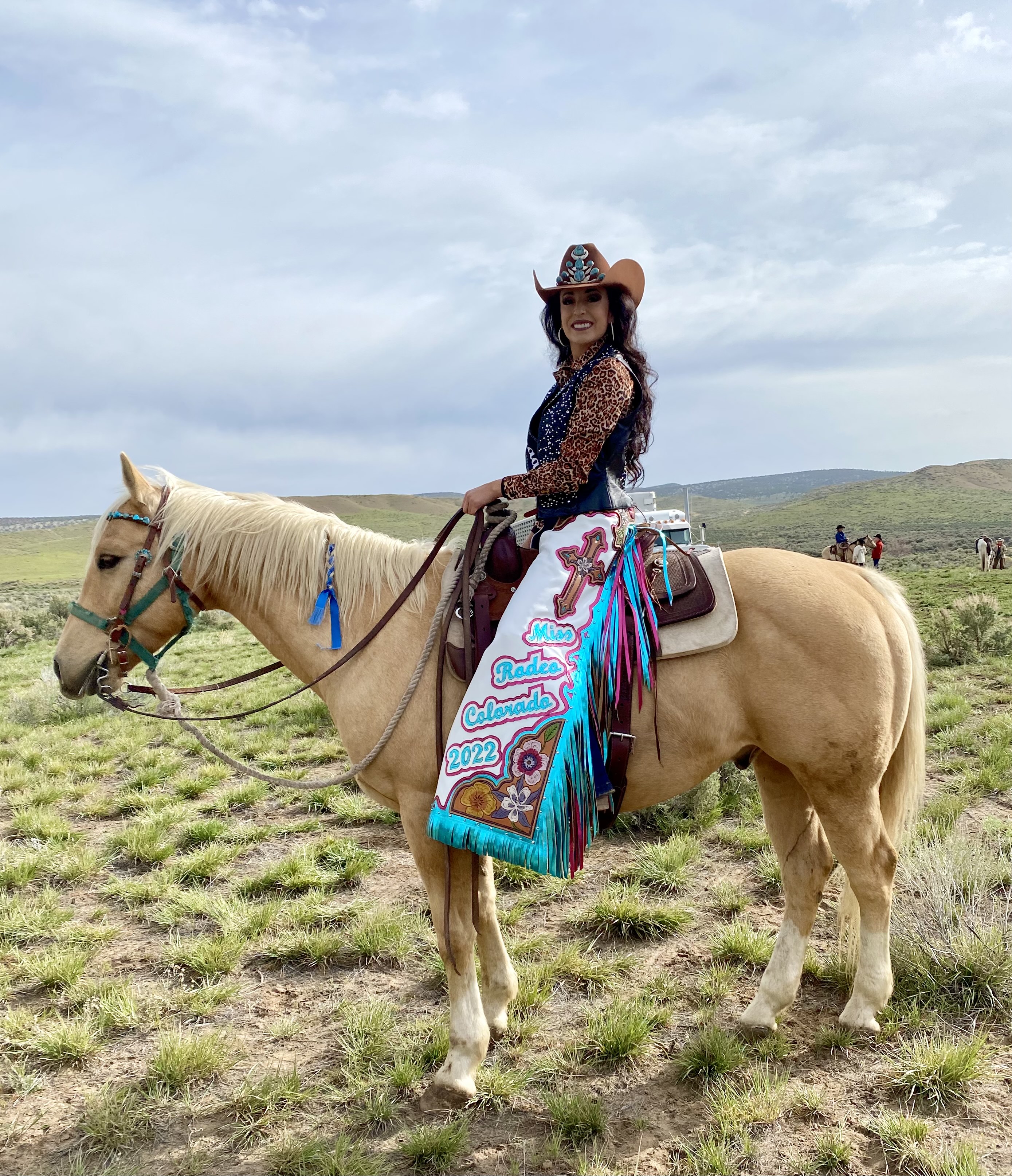 ¡Hola! Ashley Baller, Miss Rodeo Colorado 2022 here. I’ve always been enamored by the rodeo queen’s unique form of expression through her chaps. My floral, colorful pair tell a special story! At first glance of my Pro Rodeo Original chaps, my intention is for them to showcase my faith, my culture and bright positivity. My big brother is an artist, so I tasked him with designing them. All I let him know was that I wanted to include flowers (a Columbine and two native to Mexico). With that, he perfectly sketched a design that included Colorado’s state flower, the Giant Ombré Hibiscus, the Mexican Tulip Poppy and a cross to represent my faith. With elegant tooling, we included in Spanish “Dios es Amor” (God is Love) in the yoke. They were truly designed with love and the Spanish flare speaks to a key piece of my platform in building community with Spanish and English speakers. What’s so neat about them is that they’re tooled with my brother’s exact artwork! Dale and Hannah at Pro Rodeo Originals did spectacular work. Dale also built my very first pair of rodeo princess chaps when I was 12-years-old! This is another reason why my Miss Rodeo Colorado chaps are so special!